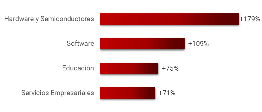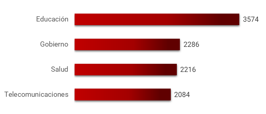 Los sectores con mayor número absoluto de ciberataques semanales fueron Educación (3.574), Gobierno (2.286), Salud (2.216) y Telecomunicaciones (2.084). Por otro lado, los sectores con mayor incremento porcentual respecto al año anterior fueron Hardware y Semiconductores (+179%), Software (+109%), Educación (+75%) y Servicios Empresariales (+70%):